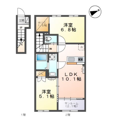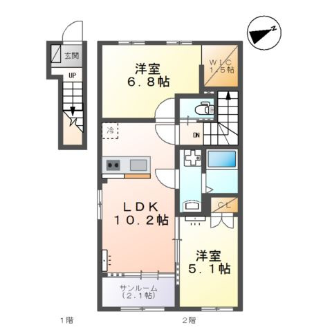 LDK 10.2帖 1室/洋室 6.8帖 1室/洋室 5.1帖 1室 - 向き